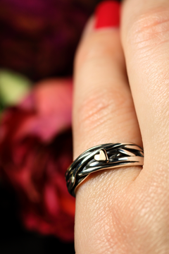 Der HERZ AUS GOLD Ring aus Silber 925 mit 18-karätigem Rosé Gold ist ein Symbol für unendliche Liebe und ein goldenes Herz. Der Ring ist ein Einzelstück in dieser Form und besticht durch sein kunstvoll verwobenes Design – ein Zeichen tiefer Verbundenheit. Das von Hand gefeilte Herz aus 18K Rosé Gold verleiht dem Schmuckstück eine warme, liebevolle Note.