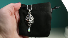 In sorgfältiger Handarbeit aus Sterlingsilber gefertigt, fliesst der Anhänger von einem schimmernden Mondstein-Tropfen in eine lebendige, regenbogenfarbene Opalträne über – eine berührende Metamorphose, die das Zitat eindrucksvoll widerspiegelt: