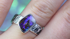 Im Herzen dieses Rings leuchtet ein geheimnisvoller Wood Boulder Opal in tiefen Indigo- und schimmernden Blautönen – wie eine ferne Galaxie, eingefangen in Stein.