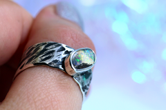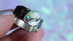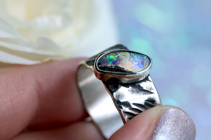 Die organisch gehämmerte Struktur des Silbers verschmilzt förmlich mit dem Opal und erzeugt eine rohe, erdige Ästhetik – kraftvoll, mystisch und natürlich.